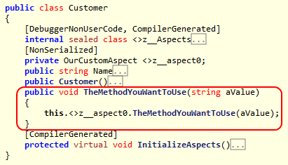 [PSerializable] public class OurCustomAspect : InstanceLevelAspect { public void TheMethodYouWantToUse(string aValue) { Console.WriteLine("Inside a method that was introduced {0}", aValue); } }Note