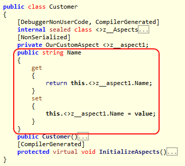 [OurCustomAspect] public class Customer { public string Name { get; set; } }After compilation, you can decompile the target code and see that the method has been added.