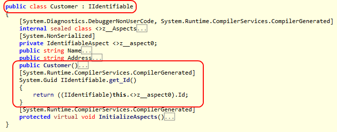 [IdentifiableAspect] public class Customer { public string Name { get; set; } public string Address { get; set; } }After compilation, you can decompile the target code and see that the interface has been added to it.