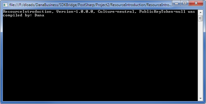 targetElementobject passed in is cast to anAssemblyobject from which the assembly named is retrieved. The code then gets the current date and time, concatenates it with the assembly name, and then converts this string to a byte array. The byte array is then stored along with a name for the data in PostSharp’s ManagedResourceIntroductionAspect object, and returned via an AspectInstance. PostSharp then embeds the resource into the current assembly.Open your project’s AssemblyInfo.cs file and add a line to include the