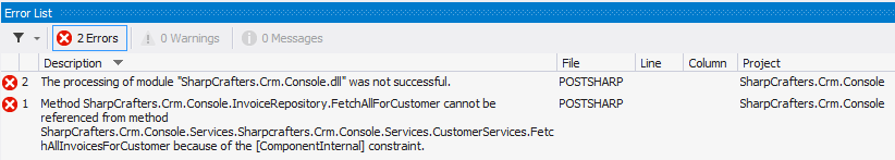 Typewhich allows you to define many different component types that should be granted access.public class InvoiceRepository { [ComponentInternal(typeof(Sharpcrafters.Crm.Console.Services.InvoiceServices))] internal IEnumerable<Invoice> FetchAllForCustomer(Guid id) { //dostuff return null; } }Now if you try to access this component from a type that hasn't been granted access you will see a compile time warning in the Output window.