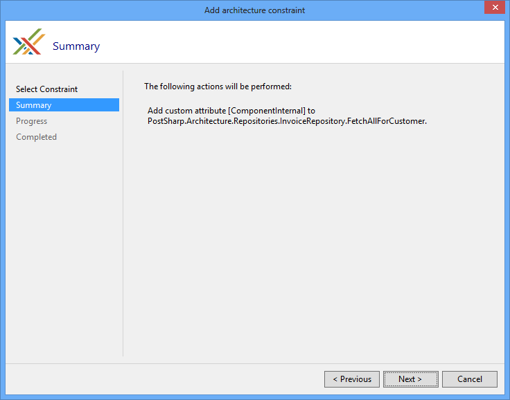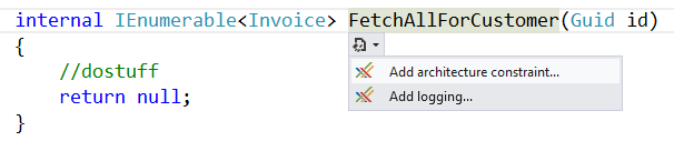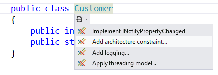 Customerclass so that it can only be accessed from the assembly it resides in.namespace Sharpcrafters.Crm.Core { public class Customer { public int Id { get; set; } public string Name { get; set; } } }Place the caret on the publically declared component that you want to restrict external access to and expand the smart tag. Select "Add architectural constraint" This procedure requires Visual Studio Tools for Metalama and PostSharp to be installed on your machine. You can however achieve the same results by editing the code and the project manually. .