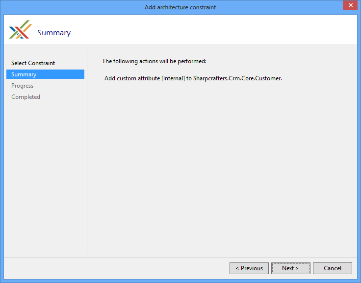 The summary page gives you the opportunity to review the selections that you have made. If you notice that the configuration is not what you wanted you can click the Previous button and adjust your selections. If the configuration meets your needs click Next. In this demo, you will see that the [InternalAttribute] attribute is being added to the