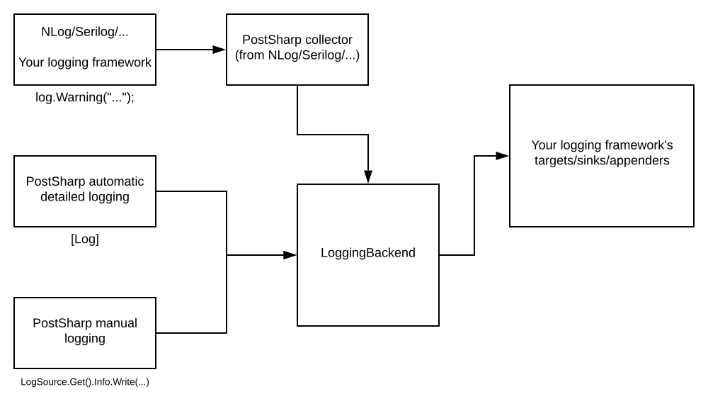 If you use log collecting, then logging events that you create with your logging framework are sent to a special PostSharp target/sink/appender (terminology varies between logging frameworks). This target collects the logging events and sends them through the PostSharp pipeline to your logging backend. This would usually be the backend for your logging framework, but it could be any logging backend in principle. The logging backend sends the transformed events to the final output using the targets/sinks/appenders you specify for your logging framework.