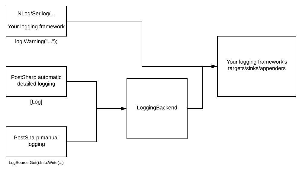 Automatic detailed logging and LogSource use the PostSharp pipeline. This means that they are sent to the same configurable PostSharp logging backend and share the same indentation level. The logging backend then sends both kinds of events to your logging framework. From there, they are sent to the final output, such as a file or the console.