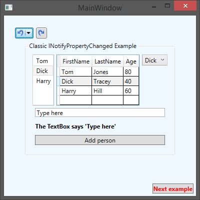 xmlns:model="clr-namespace:PostSharp.Patterns.Model.Controls;assembly=PostSharp.Patterns.Xaml"To add Undo and Redo buttons to the user interface, including the following two lines of XAML.