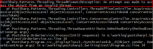As you can see that a ThreadMismatchException exception was thrown. This happened because the orderService instance was created on the main thread and the BackgroundWorker thread attempted to execute it. Because the OrderService class has been marked with the ThreadAffineAttribute attribute only the thread that creates an instance of it can access that instance.