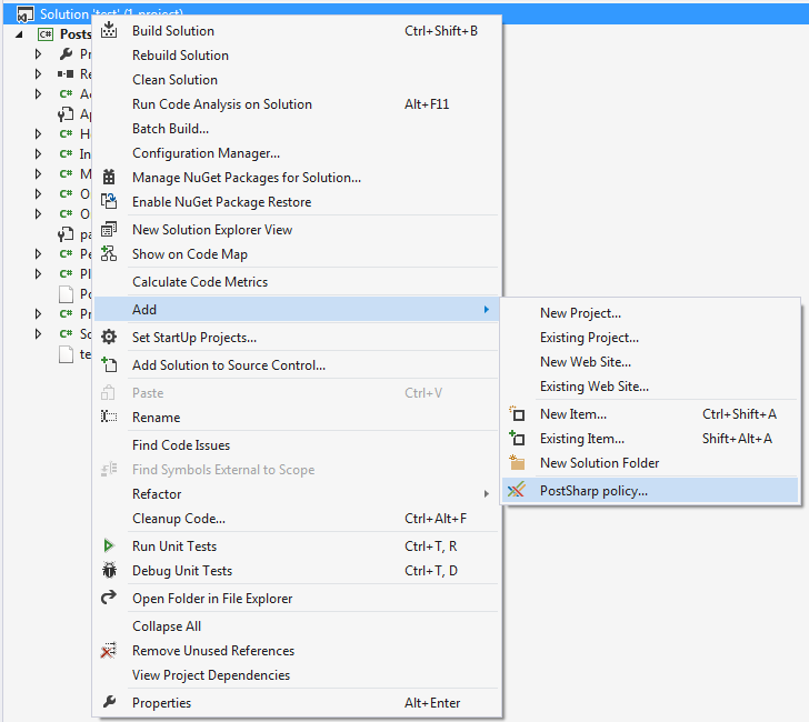 Right click on your solution or your project in Solution Explorer, select Add followed by PostSharp Policy...